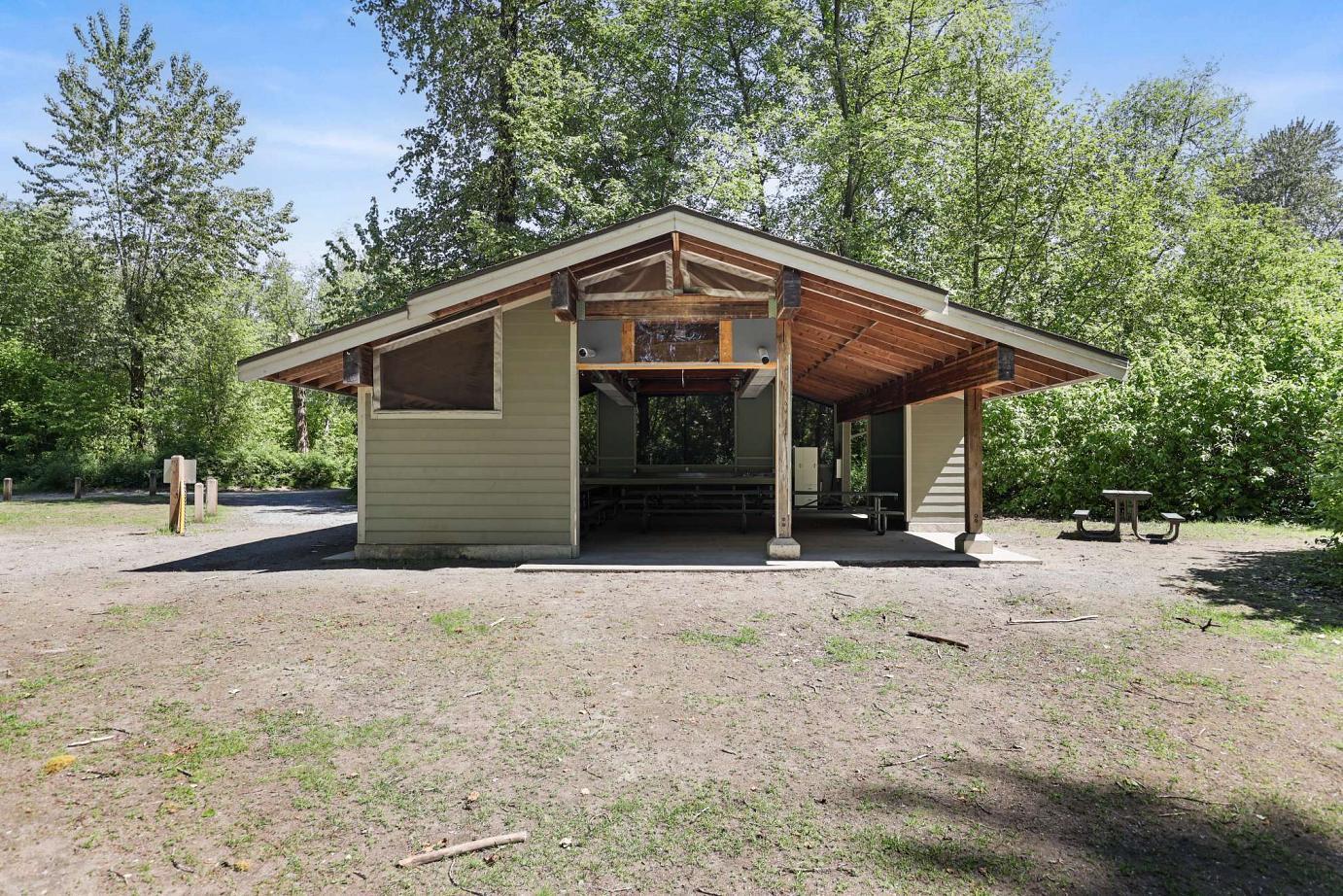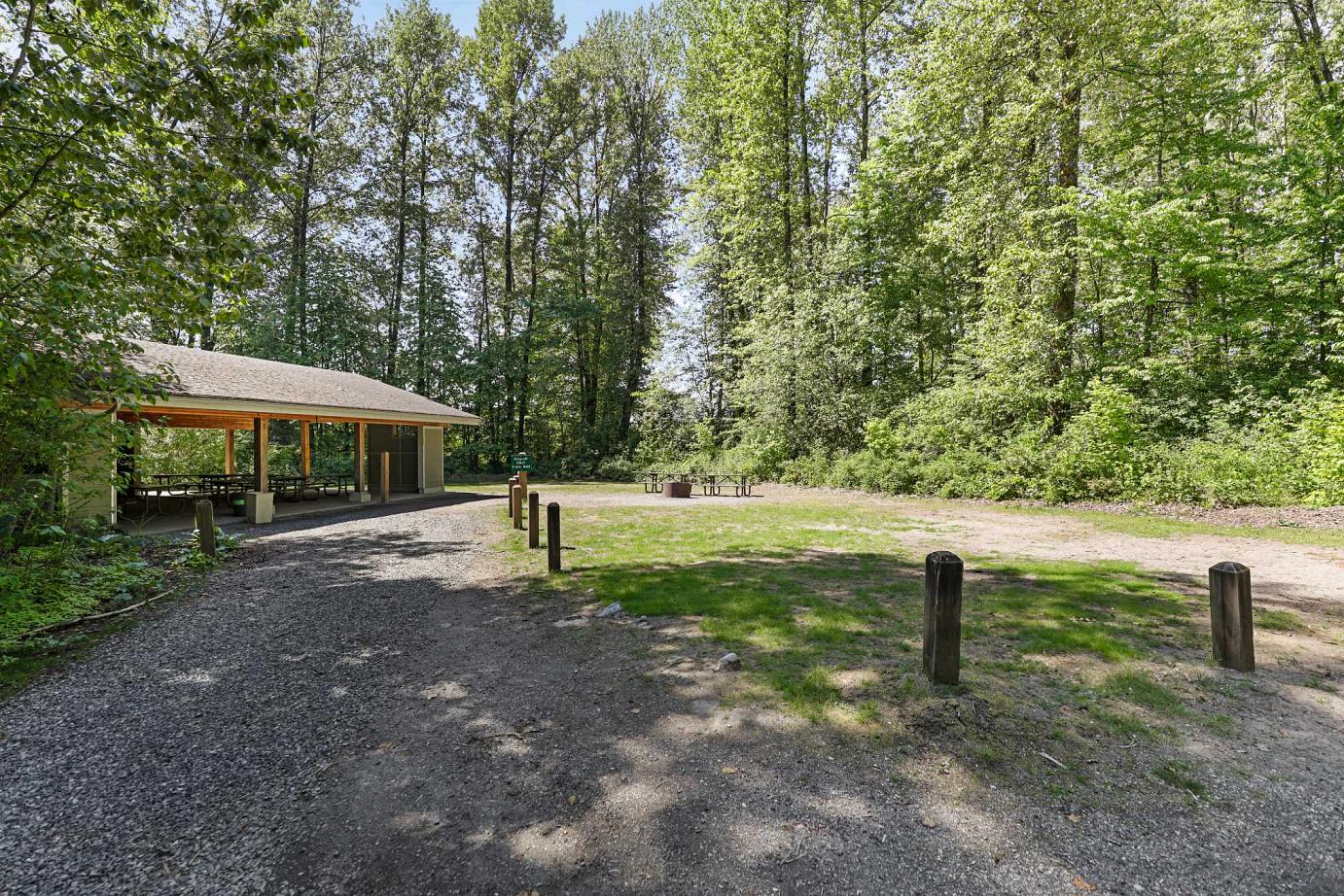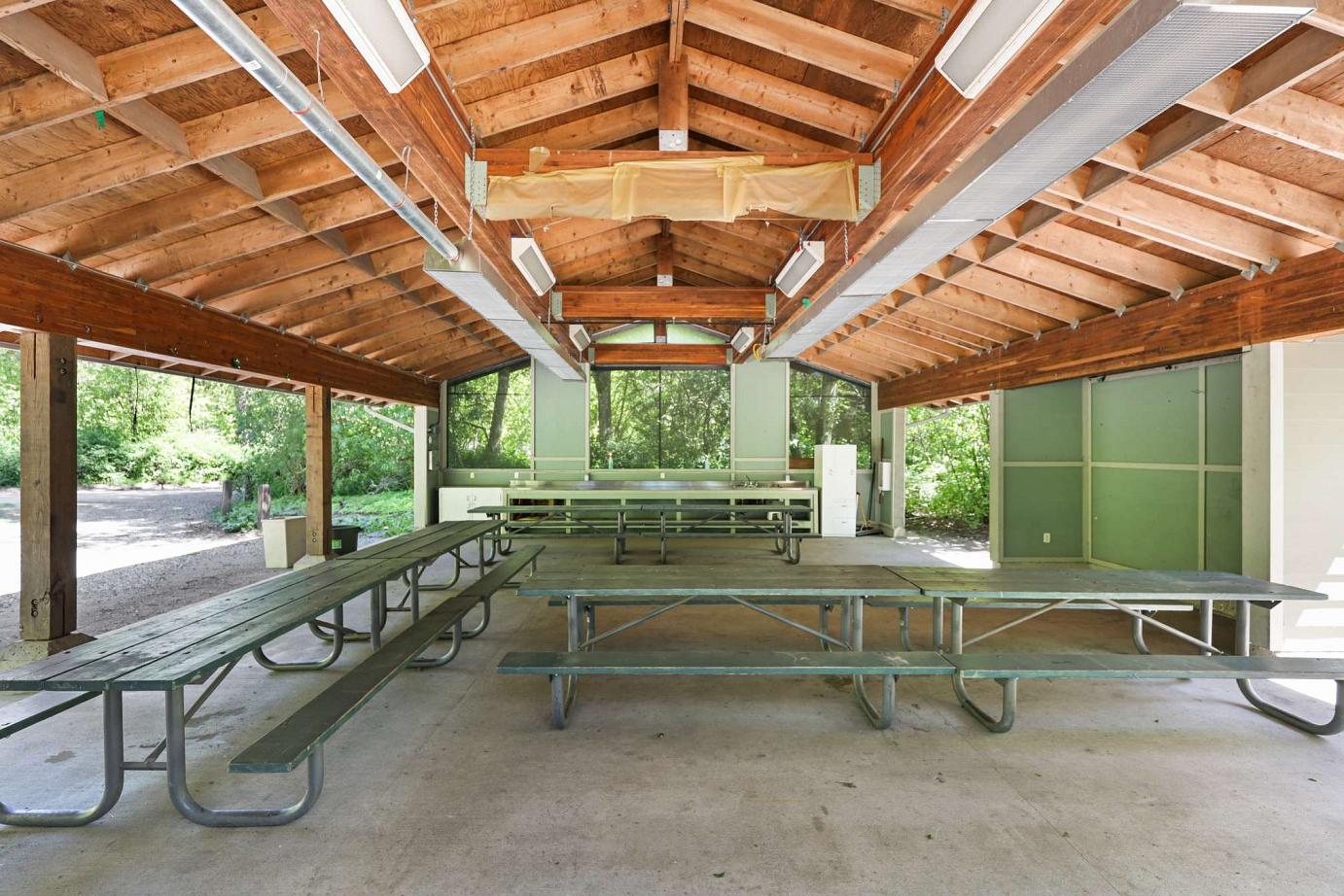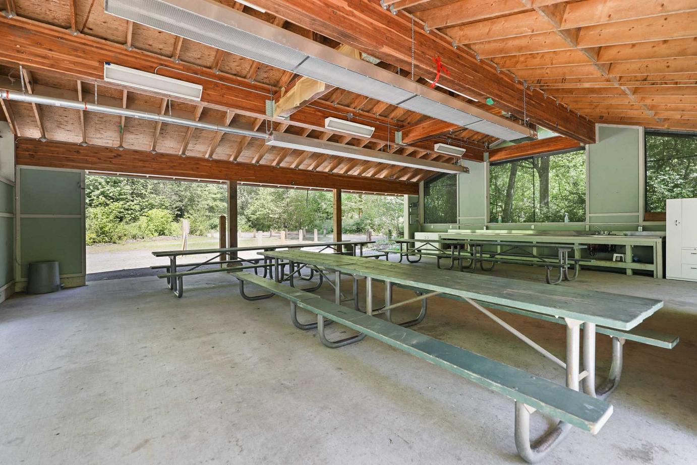- Large covered picnic area with limited power (enough to plug in a coffee maker), sink with cold water, stainless steel counter top, and picnic tables with seating for 65.
